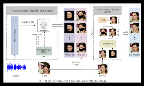研究围绕真实场景视觉配音难题,提出以“运动-纹理协同融合”驱动的高保真生成框架,为复杂头动条件下的自然口型合成带来新突破。团队指出,传统视觉配音在头部转动、侧脸或遮挡时易产生唇周纹理模糊与修复不连续的“补丁感”。为此,论文引入3D可变形人脸模型作为中间表示,将任务分为“语音驱动三维表情运动预测”和“运动引导纹理生成渲染”两阶段:先让人脸运动精准可控,再用运动信息反向约束纹理补偿,从源头提升几何一致性与纹理真实度。研究的核心创新在运动与纹理的联合建模,渲染阶段通过语义引导的运动流场实现全局非刚性对齐,确保跨姿态下“动得对”;随后运动感知纹理调制模块在流场约束下调制多尺度纹理特征,把运动结构直接转化为纹理生成先验,稳定恢复嘴唇与唇周高频细节;再结合多参考纹理与自适应融合,兼顾全局运动一致与局部细节自然过渡。实验表明,该策略显著提升纹理清晰度与稳定性,并在VoxCeleb1/2等数据集上全面优于现有方法。